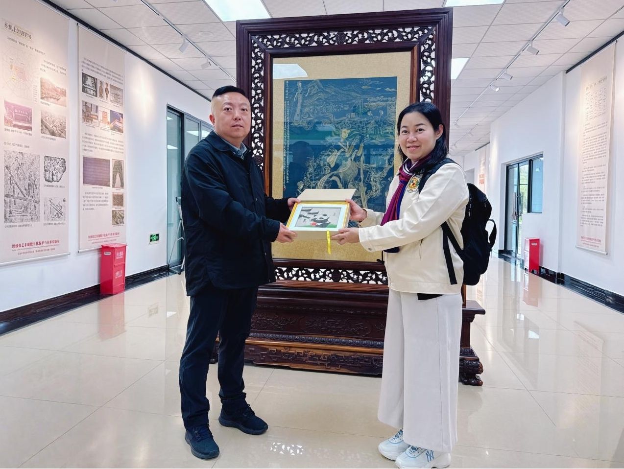 参观活动临近尾声,鲜金宏代表学校向易三仓大学工程、科学与技术学院助理院长本查湾·斯里苏拉博士赠送了一幅以熊猫为主题的蜀锦挂画作为礼物。此挂画以具有四川特色的熊猫为原型,运用蜀锦织造技艺精心制作而成,展现了我校在非遗文化传承方面所取得的成果,也体现了学校对此次交流活动的重视,更寄托了深化中泰高校在非遗保护、技术研发、人才培养等领域合作的期望。