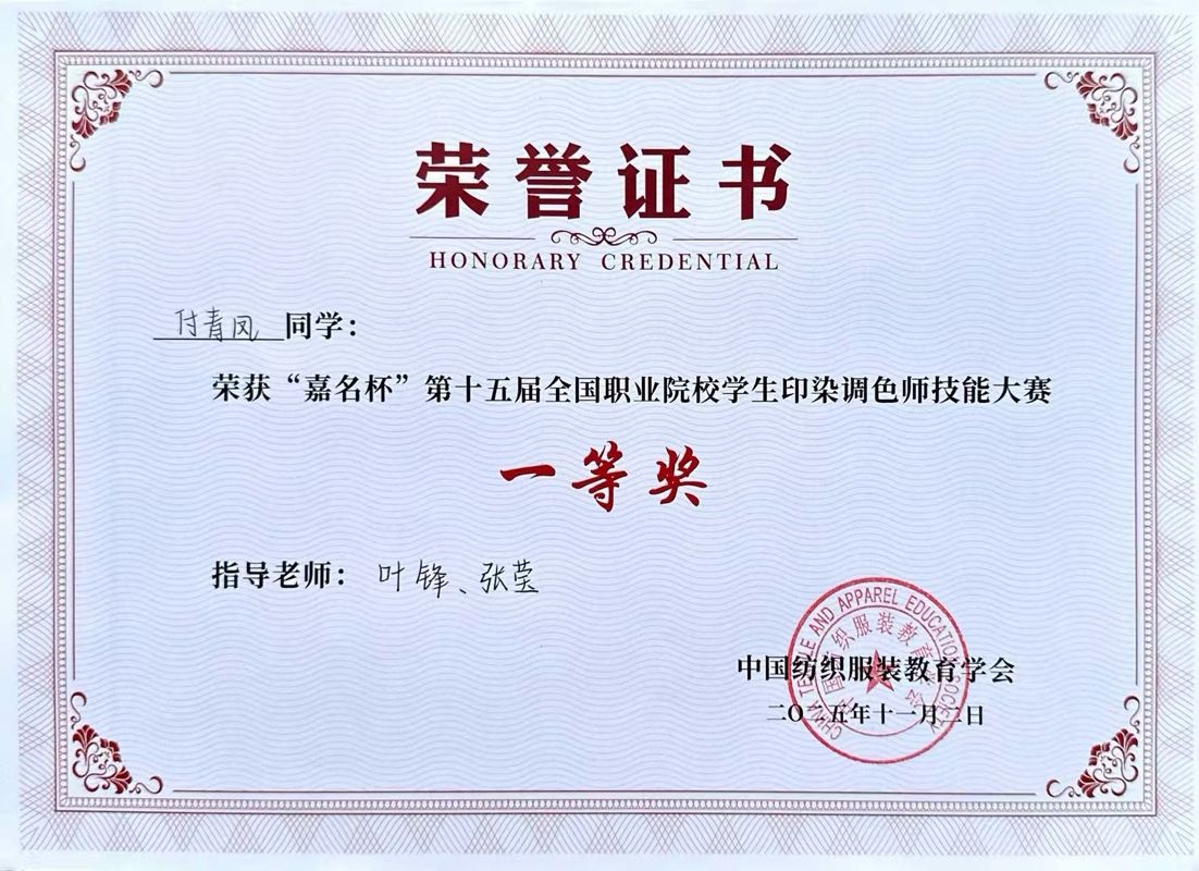经过激烈角逐,轻材学子凭借扎实的专业技能与顽强拼搏的精神脱颖而出:付青风同学以对染色配方的精准把控与创新工艺设计摘得一等奖,赵丹同学荣获二等奖,谭佩欣、许玉丽同学获三等奖,易佳佳、赵猛同学获得优秀奖。