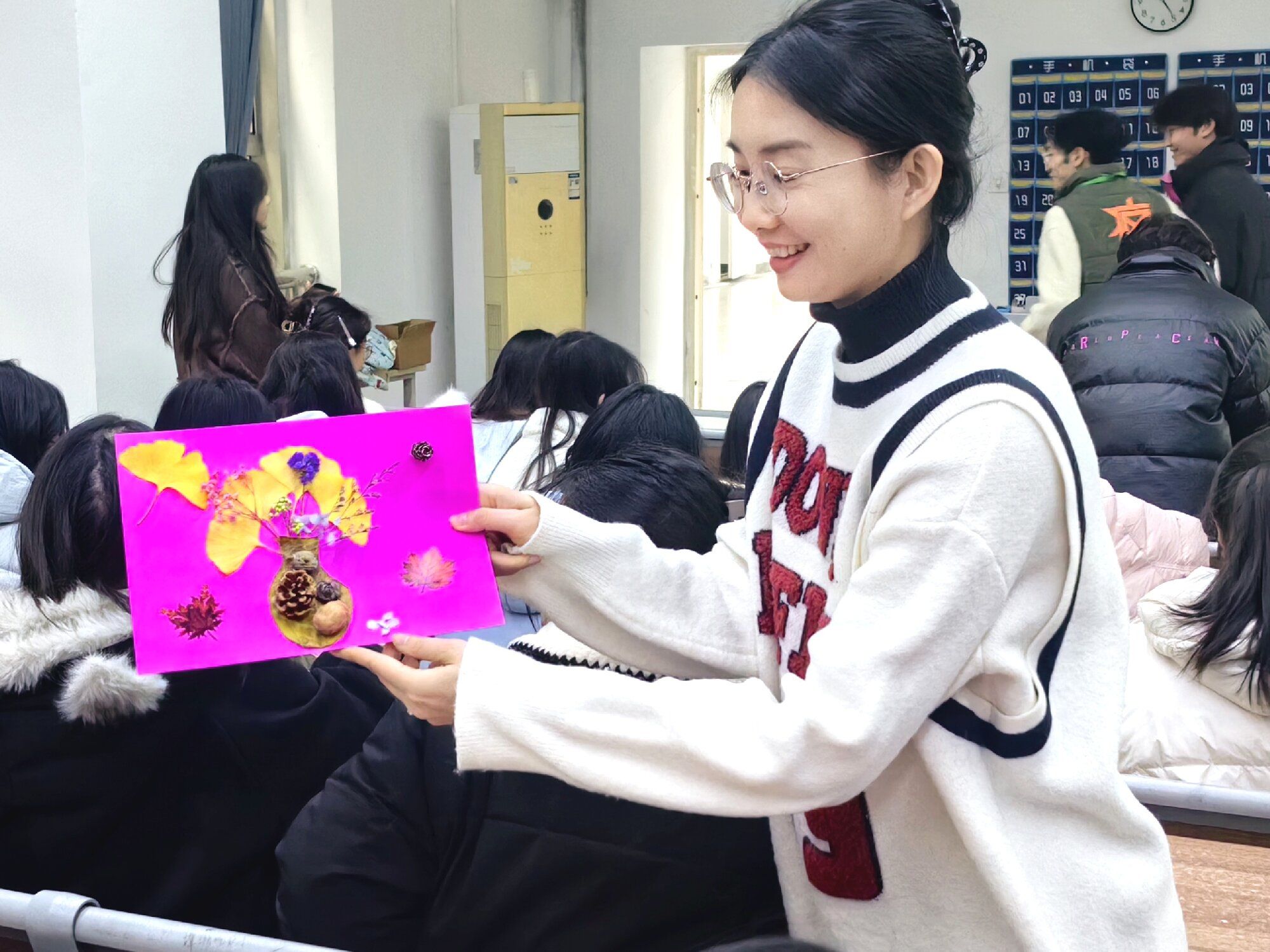 活动临近尾声,何舒婷鼓励同学们:“当前正值银杏叶如诗般飘飞的季节,大家不妨邀上三五好友,于校内就地取材,一同开展植物贴画活动,让心灵在这惬意时节放个秋假。”