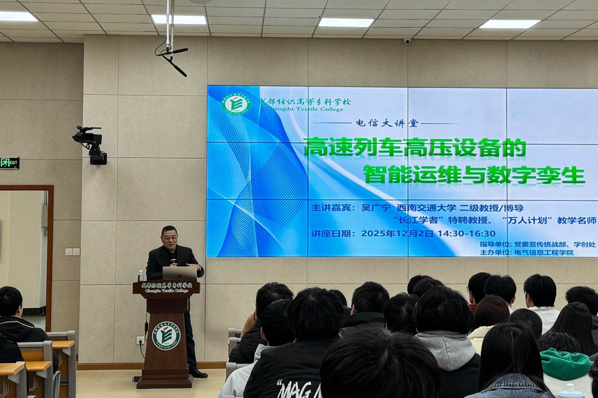 12月2日下午,西南交通大学吴广宁教授应邀来校,在明德楼一楼阶梯教室为电信学院140余名大一新生作《高速列车高压设备的智能运维与数字孪生技术》学术讲座,帮助新生了解前沿科技在轨道交通领域的应用,激发专业学习热情,树立科技报国志向。