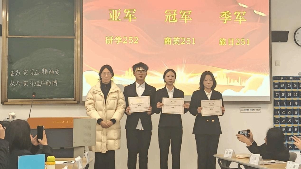 评委老师从多维度进行点评,肯定辩手表现的同时指出不足。经过公正评判,最终评选出本次辩论赛冠军班级为商英251,亚军班级为研学252,季军班级为旅日251,“最佳辩手”为付龙杰、王楚涵、马源。