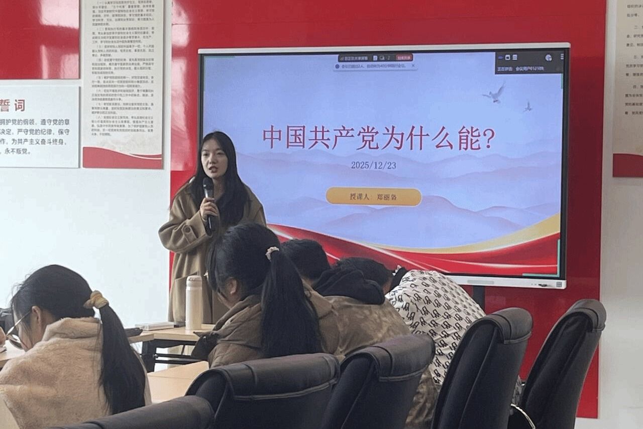 为深化支部党员对党的百年奋斗历程与执政根基的认知,筑牢理想信念根基,12月23日,文旅学院学生党支部在知著楼A405开展“中国共产党为什么能”专题党课,特邀学校马克思主义学院郑丽枭老师主讲。学院学生第一、第二党支部全体党员、发展对象及积极分子参加党课活动。