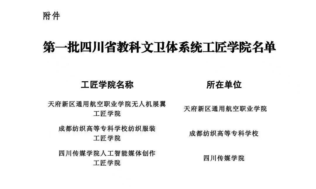 12月23日,四川省教科文卫工会印发《关于公布四川省教科文卫系统工匠学院名单的通知》,确定了第一批四川省教科文卫体系统工匠学院,“成都纺织高等专科学校纺织服装工匠学院”等3家工匠学院入选。