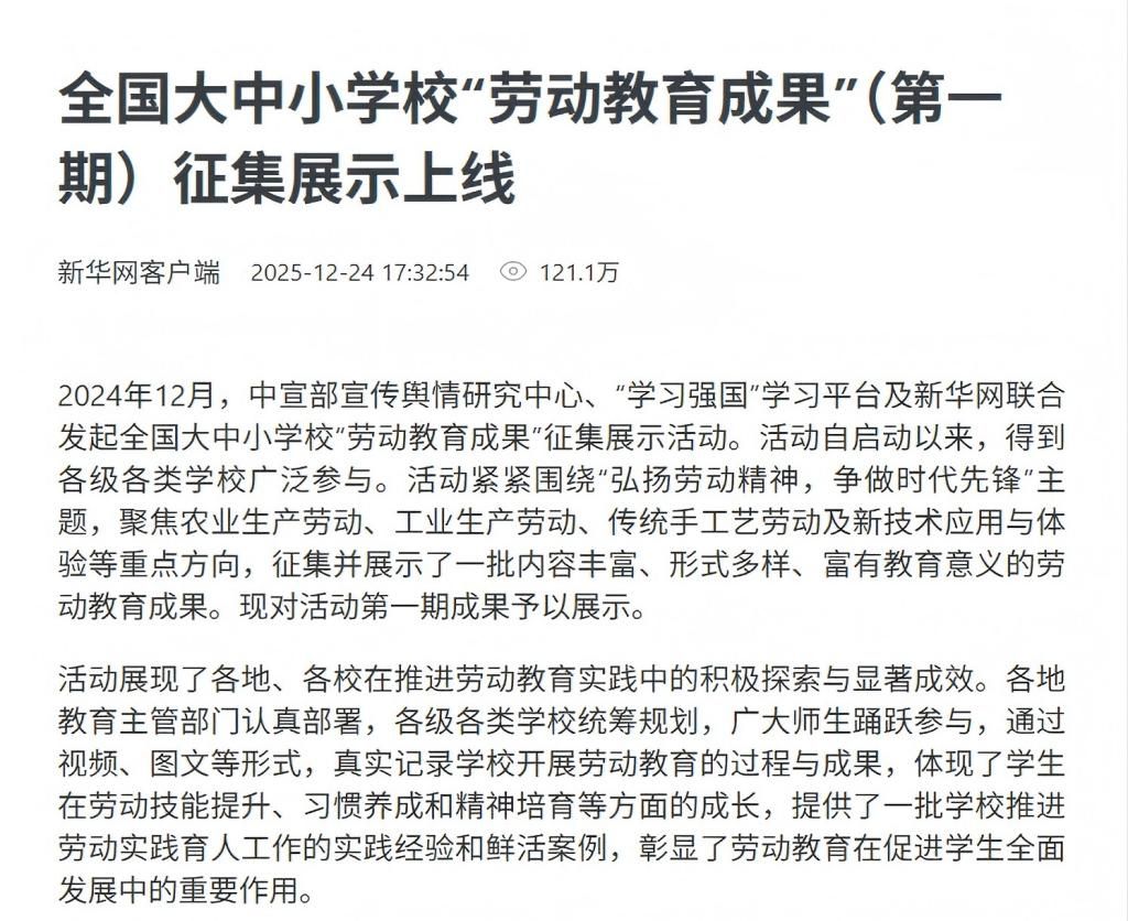 12月24日,由中宣部宣传舆情研究中心、“学习强国”学习平台及新华网联合发起的全国大中小学校“劳动教育成果”征集展示活动第一期成果揭晓,我校申报的《经纬匠心 劳动筑梦》案例从全国众多成果中脱颖而出,获评第一期“标杆案例”。
