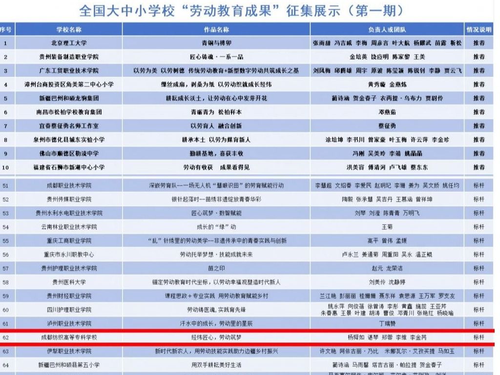 从课堂上的纺织技艺实操到田间地头的作物培育,从非遗手作的匠心传承到乡村文创的创新实践,该案例真实记录了我校学生在劳动中提升技能、养成习惯、培育精神的全过程,生动展现了学校“劳动—专业—产业”的职教特色育人范式。此次获评“标杆案例”,是对学校劳动教育创新实践的高度认可,也为全国职业院校劳动教育提供了可借鉴的鲜活经验。