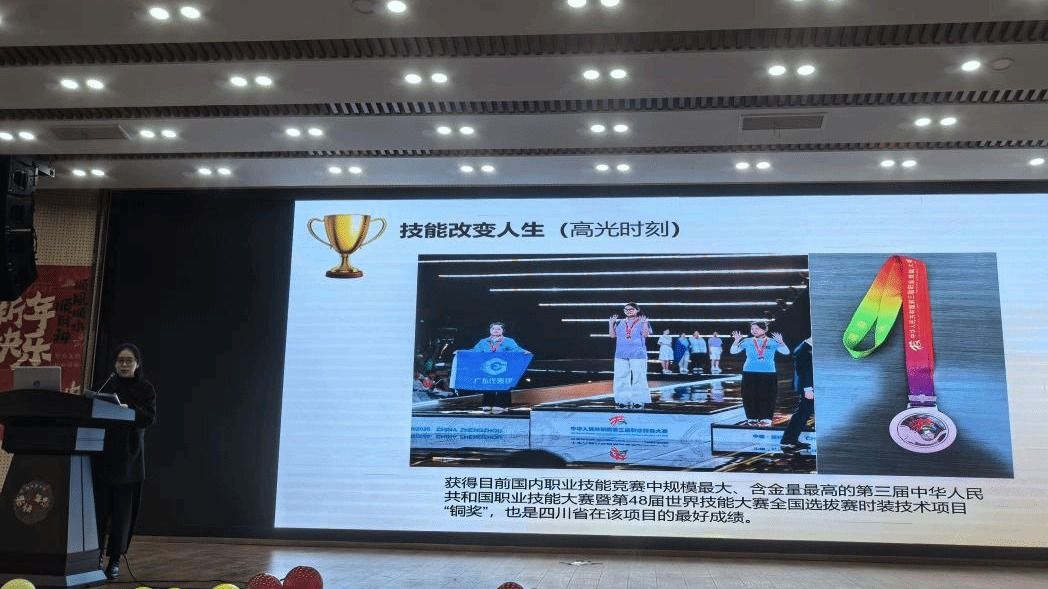 第48届世界技能大赛时装技术项目全国铜奖获得者、世赛国家集训队成员罗敬分享了自己的成长历程。从母校的实训车间到全国大赛领奖台,从一名中职生到一名职业院校教师,她以亲身经历诠释了“技能改变人生”的真谛,并勉励学弟学妹珍惜时光、苦练基本功、勇敢追逐梦想。