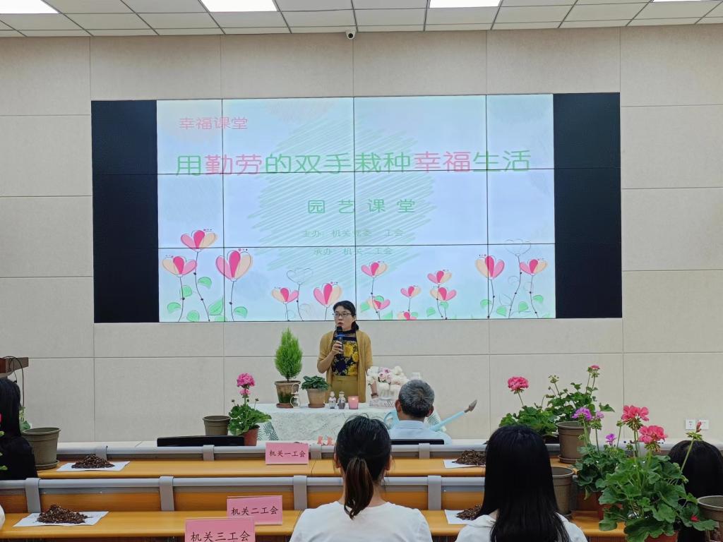 5月3日,校工会“幸福课堂”系列活动之一“园艺课堂”在综合楼一楼阶梯教室火热开班。学校党委副书记兼工会主席周红、工会专职副主席苏跃光应邀出席,开班仪式由机关党委书记刘东渝主持,机关二工会会员、学创处谌琴担任授课教师,各工会教职工热情参与学习。