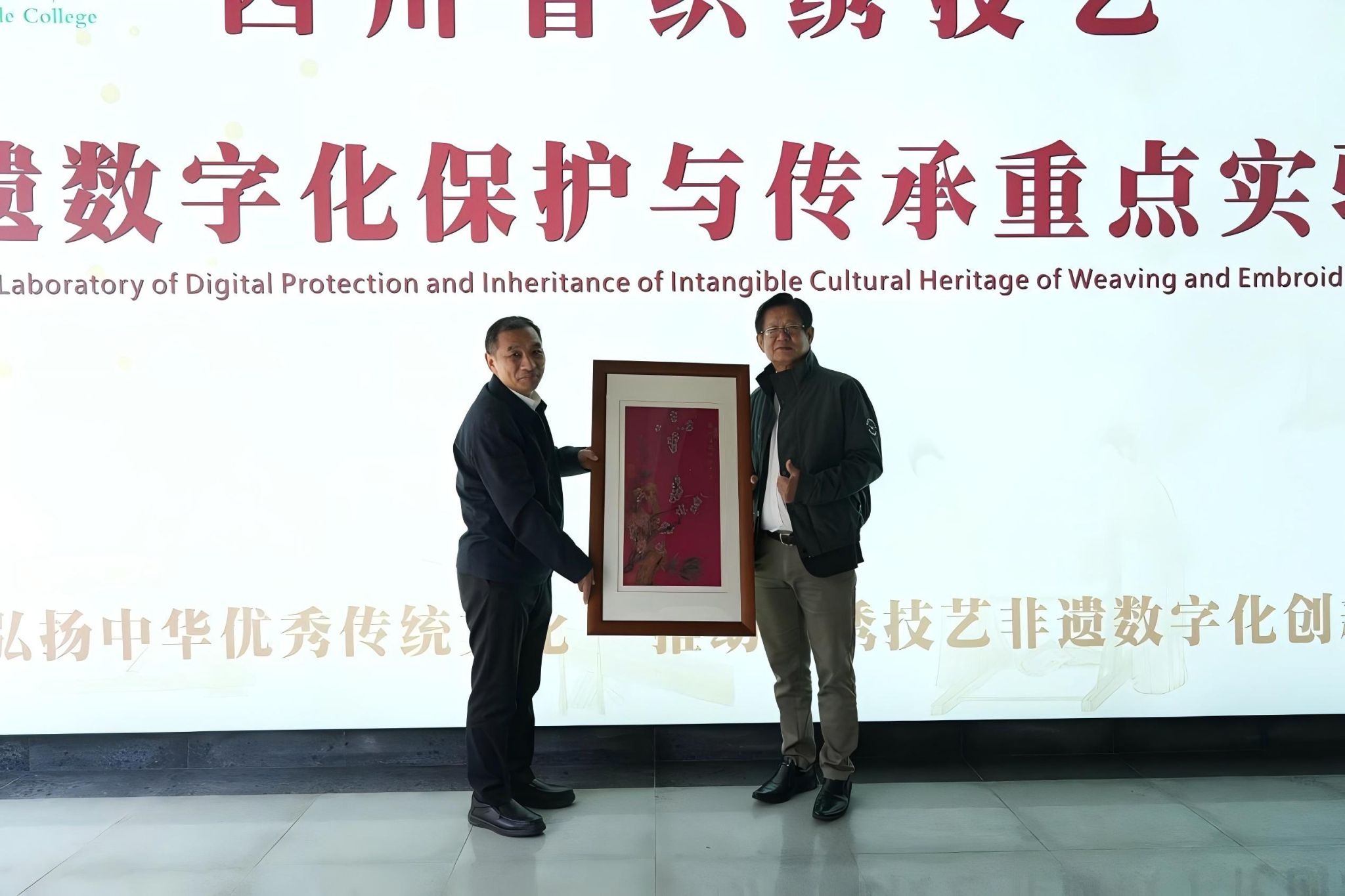 会后,代表团一行参观我校四川省织绣技艺非遗数字化保护与传承重点实验室,实地感受了我校在非遗数字化保护、织绣技艺传承与现代职业教育融合发展的成果。孙锐代表学校向来访嘉宾赠送蜀锦《梅开五福竹报平安》,以非遗文化为纽带,增进两校友谊。
