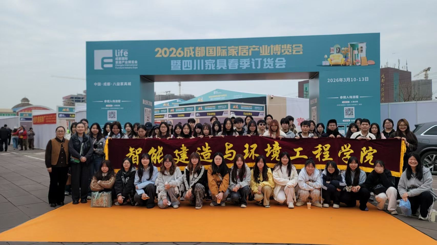 应四川省家俱行业商会邀请,3月10日,智能建造与环境工程学院文潜、卢若薇两位老师带领环艺241、环艺251两个班级学生赴成都八益家具城参加2026成都国际家居产业博览会暨四川家具春季订货会。
