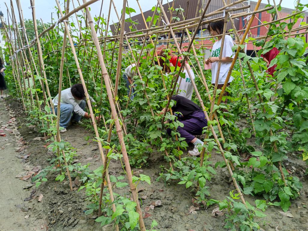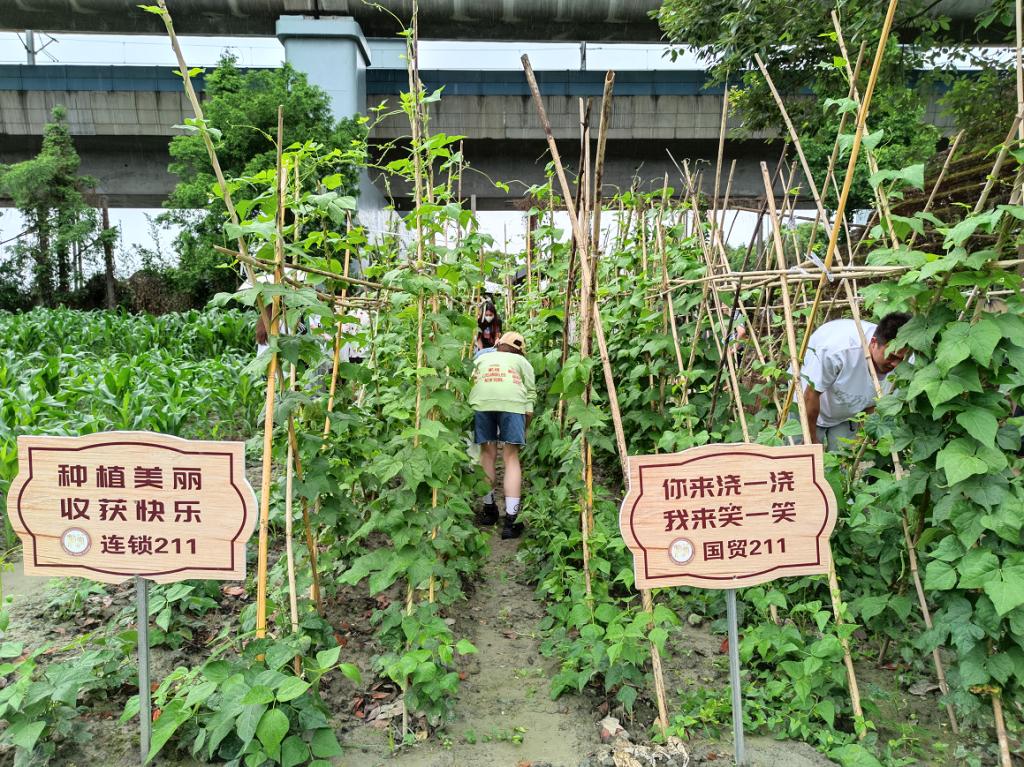 5月13日一早,连锁经营211和国际贸易211两个班的同学们与学院院长、书记及老师们,分两批次陆续到学院种植劳动教育实践基地摘蔬菜——四季豆,尽管天公不作美,阴雨绵绵,也抵挡不住同学们亲手采摘自己所种蔬菜的丰收喜悦。