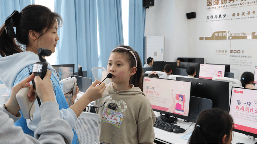 活动紧扣“研学+产教融合”理念,依托学校优质实训资源,设计了大学探秘、趣味英语课堂、非遗绳编技艺、童星主播四大板块。上午,孩子们在大学生志愿者带领下,走进产教融合实训楼、运动场、图书馆等场所,近距离观察高校真实的教学与实训场景,了解职业教育与产业发展的紧密联系,激发对未来的职业想象。