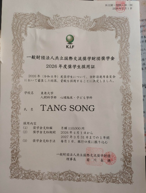 4月9日,从日本东亚大学传来喜讯:我校文旅学院23级旅游日语专业通过校际合作项目赴日参加专升本学习的唐菘同学凭借优异的综合表现,从众多申请者中脱颖而出,获得“共立国际交流财团奖学金”,是本年度日本全国8名本科生获奖者之一。