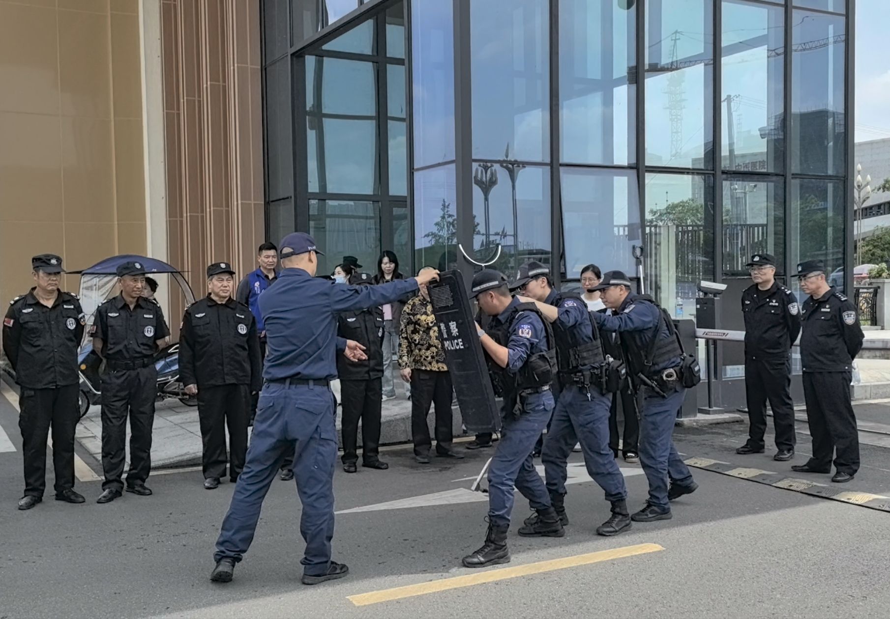 宣讲结束后,学校在邛崃产教园区正门开展反恐防暴实战演练,重点提升安保人员实操能力,确保演练贴合校园实际,实用性、针对性强。演练模拟“可疑人员携带危险物品强行闯入校园”场景。我校安保人员第一时间启动应急响应,迅速集结,手持防暴器械,按照预设流程有序开展拦截、防护、控制等操作。演练后,公安防暴大队特警现场点评,肯定安保人员的快速反应与规范操作,同时指出实操细节问题,提出针对性改进建议,明确后续日常训练重点,帮助安保人员补齐了能力短板。