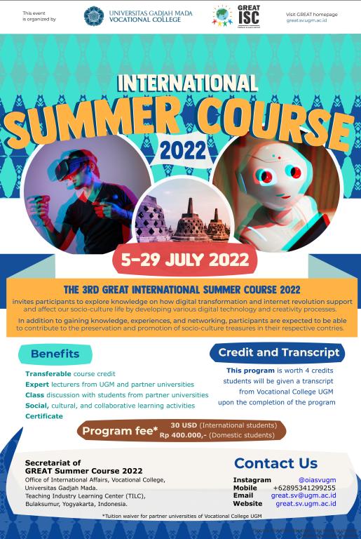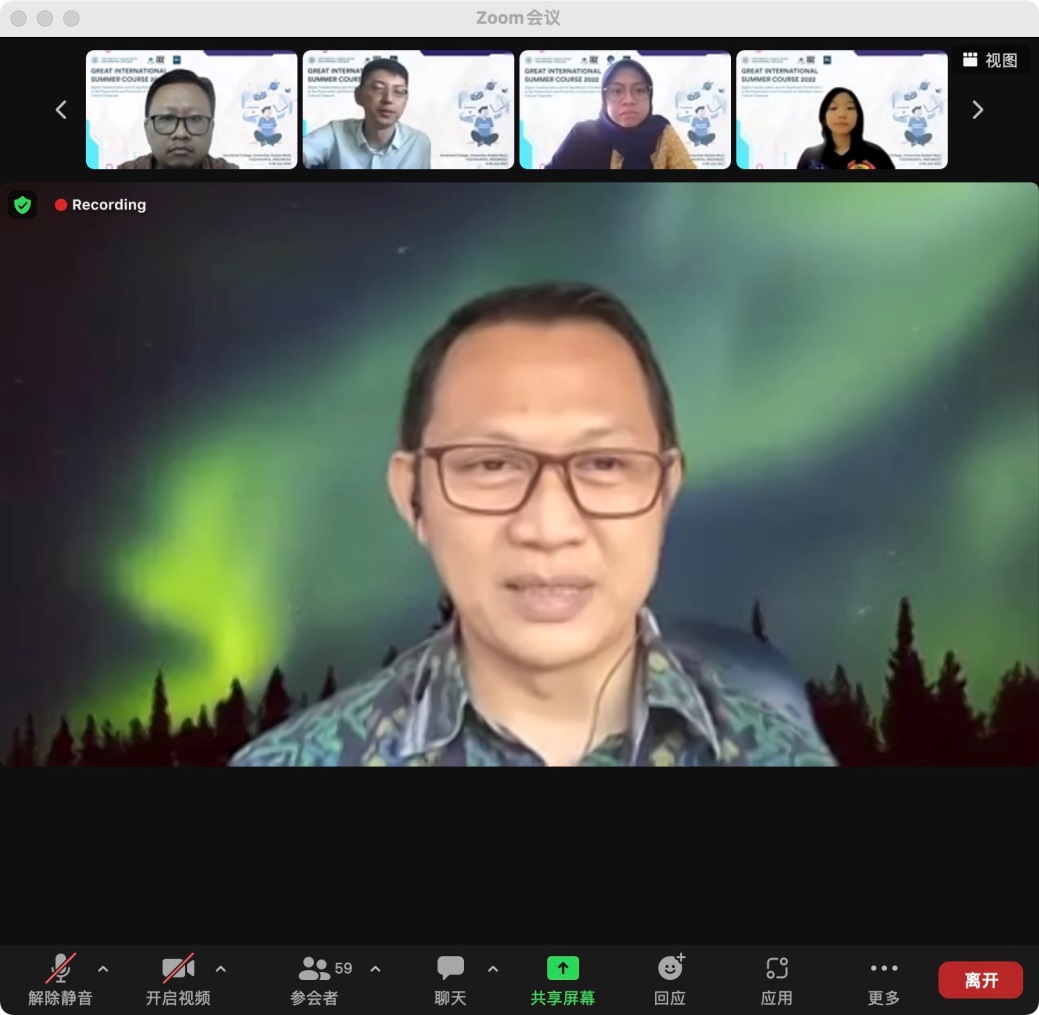 此次2022年第三届国际暑期课程由SV UGM主办,线上主题为数字媒体传播与地方文化保护措施。线上课程以讲座、研讨会、小组报告的方式展开,不仅邀请了印尼加扎马达大学本校的师生,与该校长期友好合作的国际院校也被邀请参加,其中也包括我校20名同学和2名授课教师。所有参与的学生需要在最后完成口头汇报、小组演讲和撰写文章心得的方式完成课程考核,职业学院对考核通过的学生也会寄送课程证书。