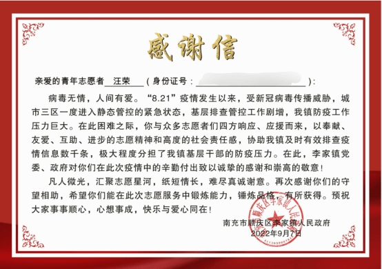 这次疫情防控志愿服务,我主要是负责检查人员信息的流动,及中、高风险地区核酸情况。这次志愿者服务的经历,让我更加明白了“纸上得来终觉浅,绝知此事要躬行”的人生哲理。