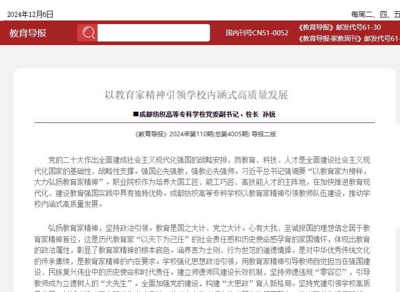 党的二十大作出全面建成社会主义现代化强国的战略安排,而教育、科技、人才是全面建设社会主义现代化国家的基础性、战略性支撑。强国必先强教,强教必先强师。习近平总书记强调要“以教育家为榜样,大力弘扬教育家精神”。职业院校作为培养大国工匠、能工巧匠、高技能人才的主阵地,在加快推进教育现代化、建设教育强国实践中具有独特优势。成都纺织高等专科学校以教育家精神引领教师队伍建设,推动学校内涵式高质量发展。