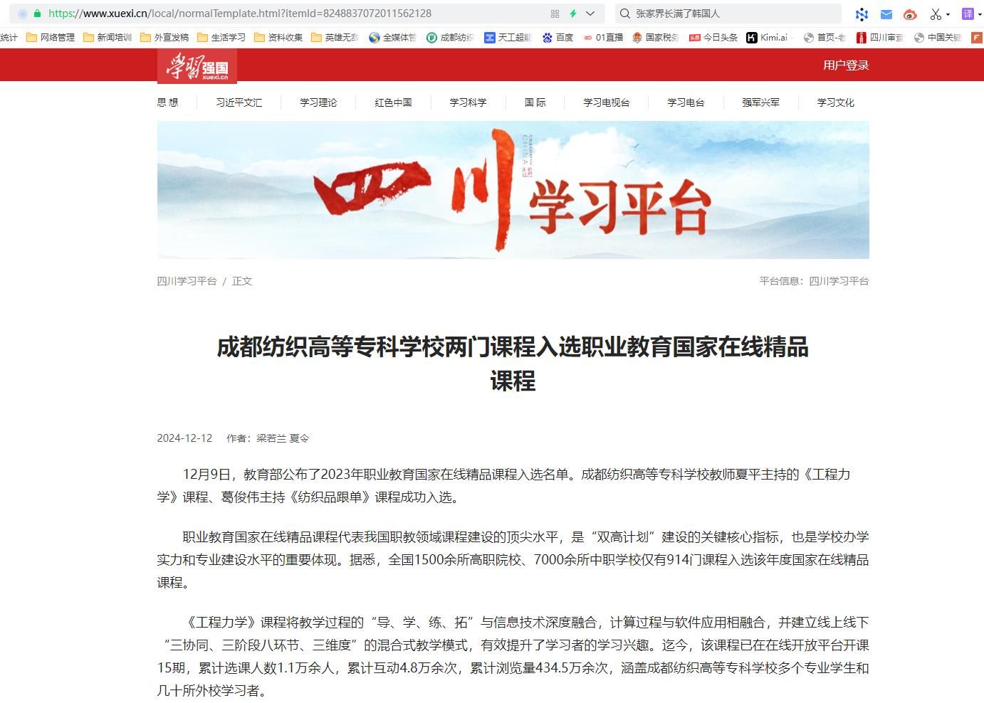 12月9日,教育部公布了2023年职业教育国家在线精品课程入选名单。成都纺织高等专科学校教师夏平主持的《工程力学》课程、葛俊伟主持《纺织品跟单》课程成功入选。