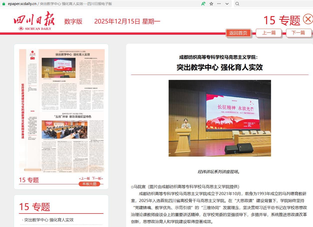 成都纺织高等专科学校马克思主义学院成立于2021年10月,前身为1993年成立的马列德育教研室,2025年入选首批四川省高校骨干马克思主义学院。在“大思政课”建设背景下,学院始终坚持“党建铸魂、教学优先、示范引领”的“三维协同”发展理念,坚决贯彻习近平总书记在学校思想政治理论课教师座谈会上的重要讲话精神,在学校党委的坚强领导下,多措并举,系统推进思政课改革创新,思想政治育人和学院建设取得显著成效。