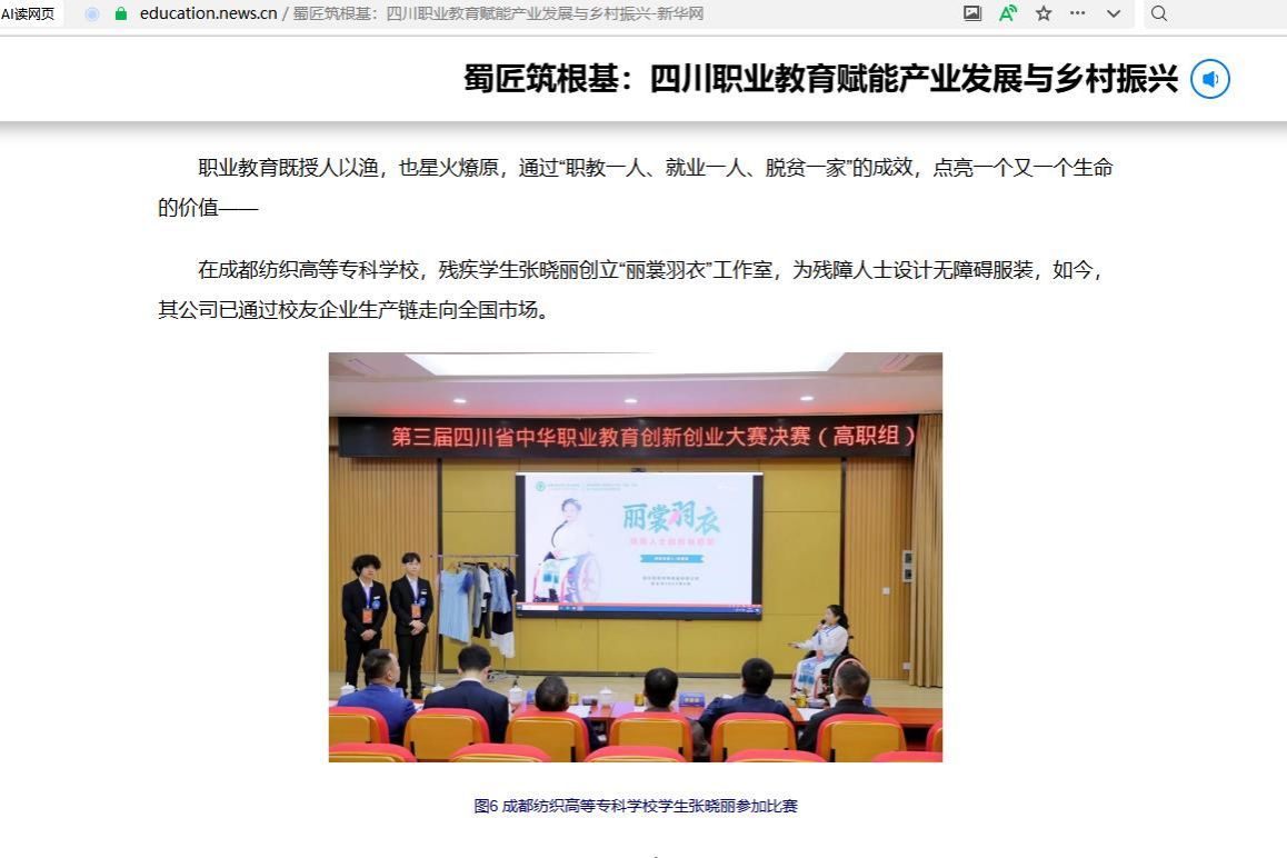 在成都纺织高等专科学校,残疾学生张晓丽创立“丽裳羽衣”工作室,为残障人士设计无障碍服装,如今,其公司已通过校友企业生产链走向全国市场。