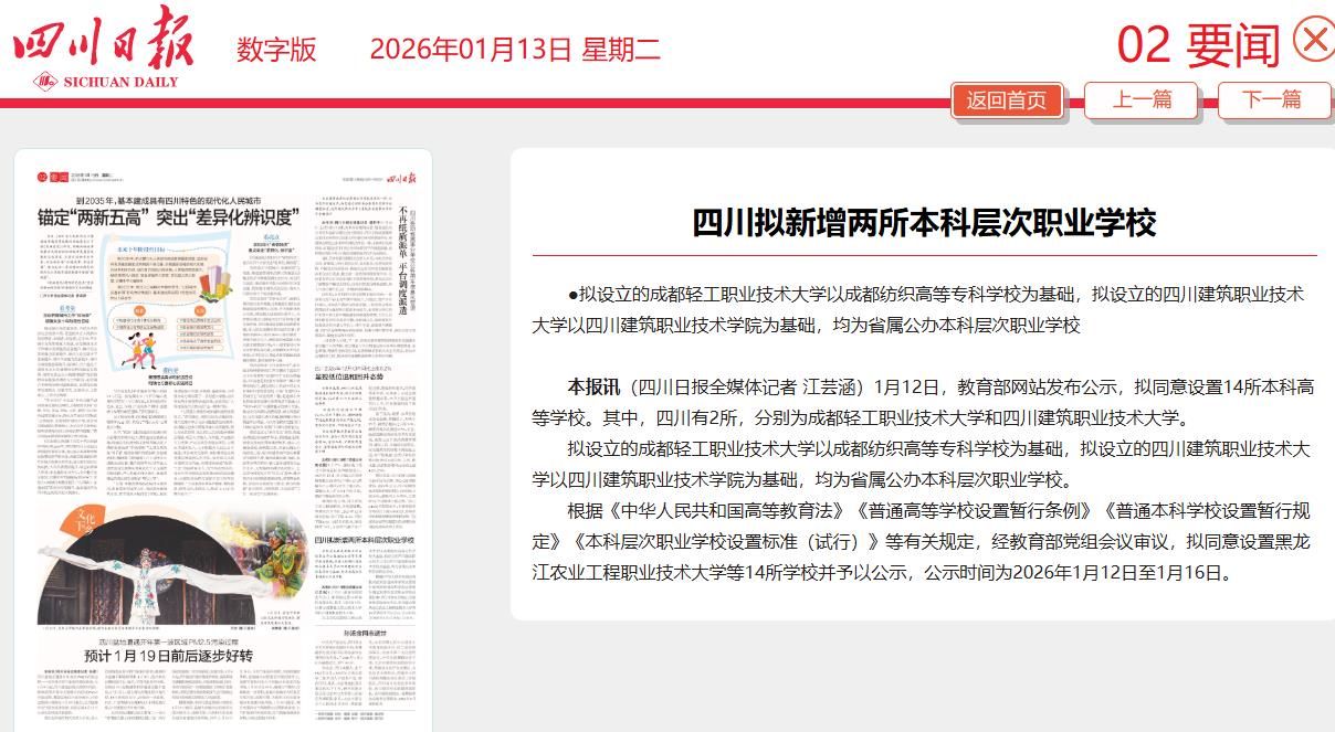 本报讯(四川日报全媒体记者 江芸涵)1月12日,教育部网站发布公示,拟同意设置14所本科高等学校。其中,四川有2所,分别为成都轻工职业技术大学和四川建筑职业技术大学。