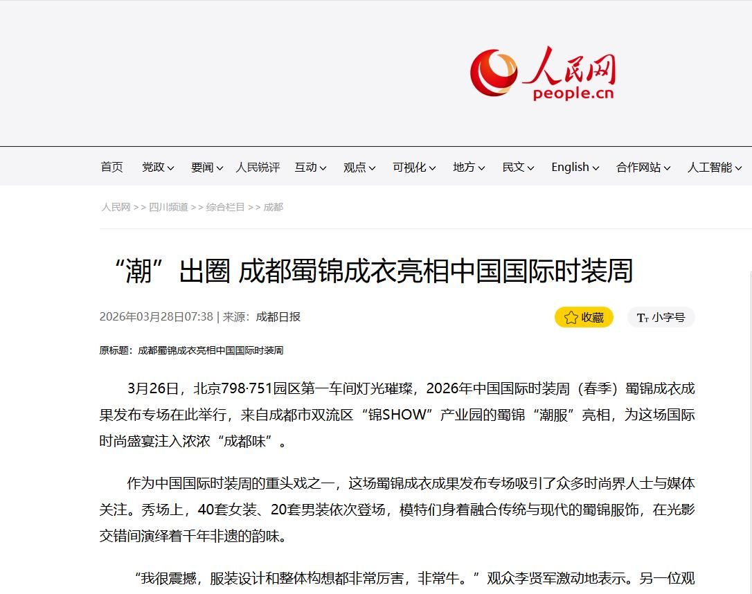 一场时尚大秀让千年蜀锦惊艳了中国国际时装周。记者了解到,本次展出的蜀锦作品是“锦SHOW”产业园入驻企业扶臻FUGENT与知名设计师曾凤飞携手打造的2026秋冬蜀锦。“锦SHOW”位于双流区黄水镇板桥社区,由老旧厂房改造而成,以蜀锦文化为核心,汇聚非遗服饰、特色茶饮、文旅体验等多元业态。目前,园区已入驻国家级非遗传承人胡光俊新作坊、华夏国锦、织山月等多家蜀锦相关品牌,成为集文化、创意于一体的沉浸式休闲空间,全力推动全链条发展与跨界融合。