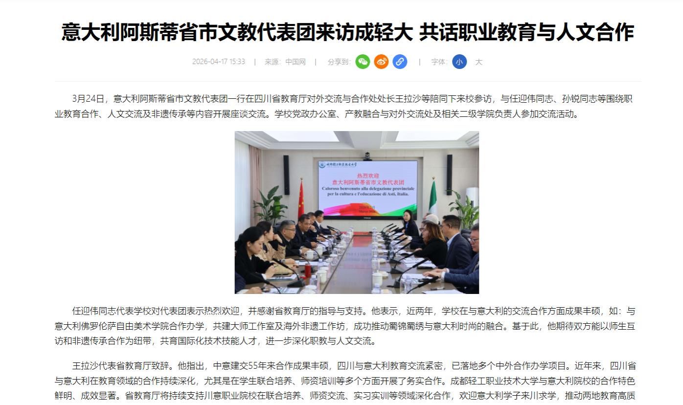 3月24日,意大利阿斯蒂省市文教代表团一行在四川省教育厅对外交流与合作处处长王拉沙等陪同下来校参访,与任迎伟同志、孙锐同志等围绕职业教育合作、人文交流及非遗传承等内容开展座谈交流。学校党政办公室、产教融合与对外交流处及相关二级学院负责人参加交流活动。