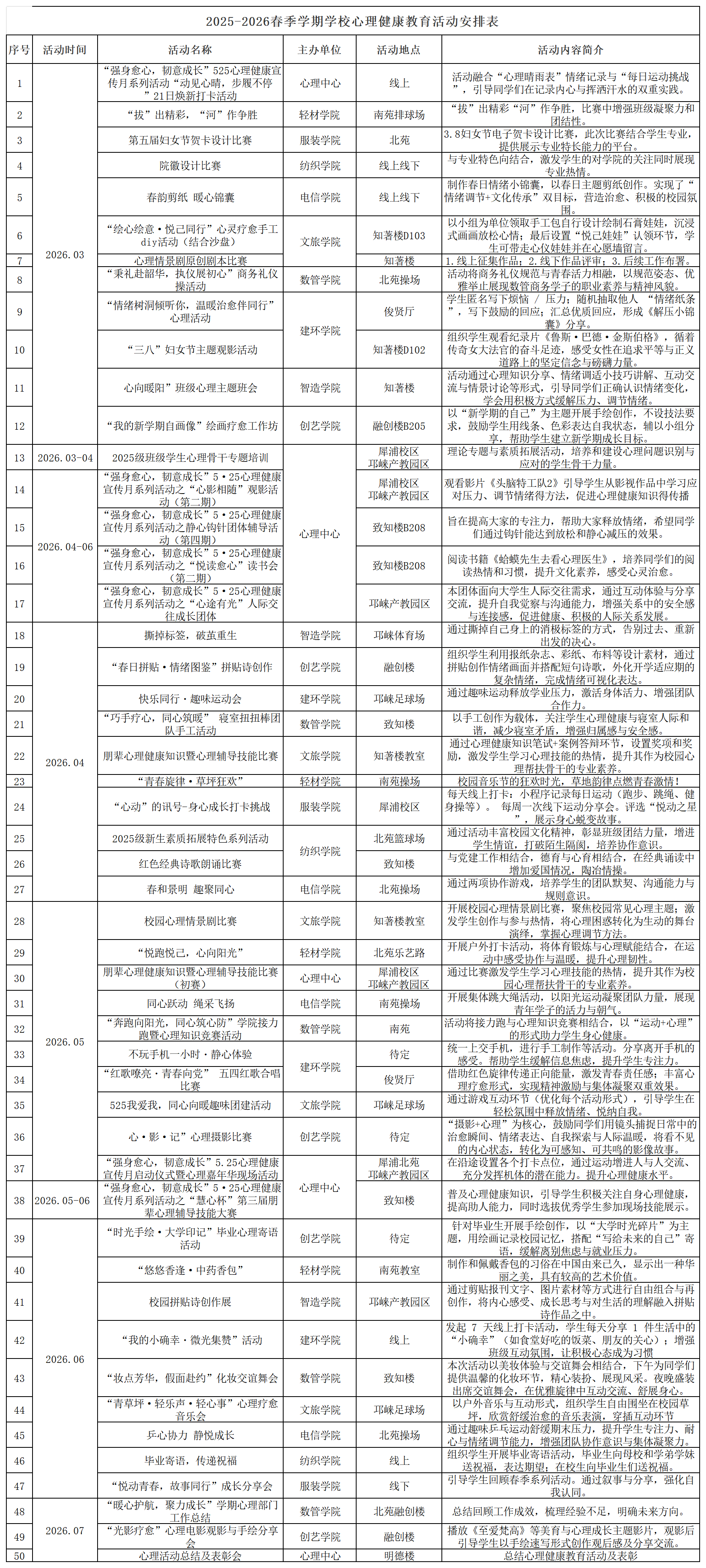 2025-2026春季学期学校心理健康教育活动安排表